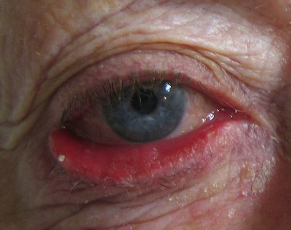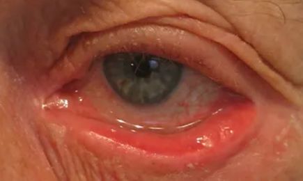 Кроме того, выворот века приводит к «разгерметизации» глазной поверхности — конъюнктива становится недостаточно защищена и начинает пересыхать, несмотря на скапливающуюся слёзную жидкость. В результате возникает покраснение и раздражение слизистой, дискомфорт и болезненные ощущения.