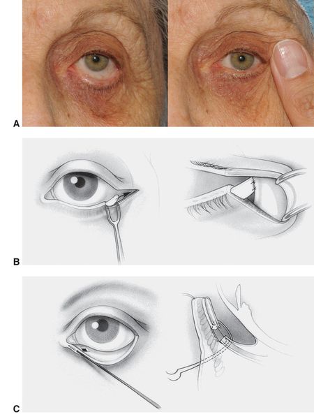 Чаще всего для коррекции выворота нижнего века применяют метод латеральной тарзальной полоски (LTS). Он очень эффективен и позволяет не только устранить перерастянутость связки, но и компенсирует потерянный тонус круговой мышцы за счёт создания вертикальной поддержки. Во время операции формируют полоску из собственного хряща нижнего века, которую фиксируют к надкостнице наружного края орбиты (часть В, на рисунке ниже).