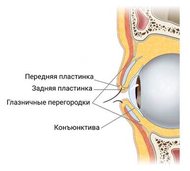 Задняя пластинка века образована в верхней части тарзальным хрящом, в нижней — мышцей-ретрактором нижнего века, а также конъюнктивой века.