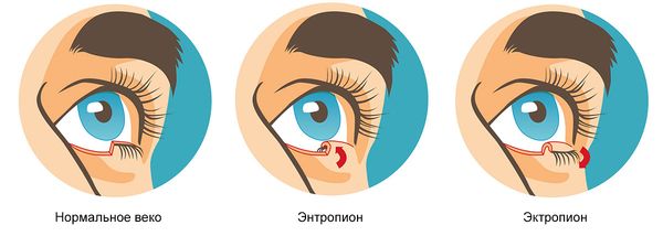 Противоположностью энтропиону (завороту) является эктропион (выворот) века. Это состояние встречается не менее часто и может иметь схожие причины. При эктропионенижнее веко отстоит от поверхности глазного яблока и как бы опускается вниз, из-за чего при закрытии глаз веки не смыкаются полностью.
