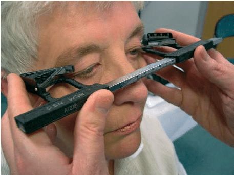 Для оценки наружной связки нижнее веко сдвигают к носу: смещение латеральной спайки век более чем на 2 мм указывает на слабость наружной связки.