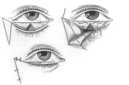 Для устранения рубцового заворота применяют различные варианты пластики века, направленные на рассечение и иссечение рубцов и удлинение тканей задней пластинки нижнего века. С этой целью используют современные хирургические методики с применением аутологичных (слизистой губы, хряща ушной раковины и пр.) и аллогенных трансплантатов (т. е. полученных от донора). Такая операция уже более сложная, её объём и длительность зависят от исходного состояния тканей век.