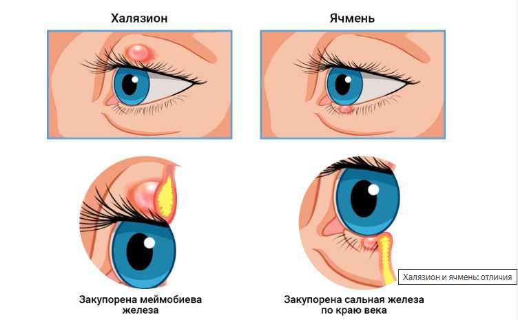 В целом халязион обычно более крупный и менее болезненный, чем ячмень. Но одно всегда может привести к другому: ячмень в конечном итоге может стать причиной хронического безболезненного халязиона, в то время как халязион — нагноиться и перерасти в острое гнойное воспаление.