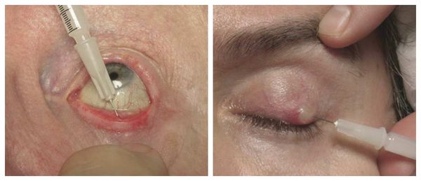 Если положительная динамика при консервативном лечении не наблюдается, взрослым пациентам назначают интралезиональную стероидную инъекцию — укол противовоспалительного препарата в халязион под местной анестезией. Стероид уменьшает воспаление в хряще и размер образования, иногда халязион полностью исчезает. Инъекция может использоваться отдельно или в сочетании с местными комбинированными каплями либо мазями.