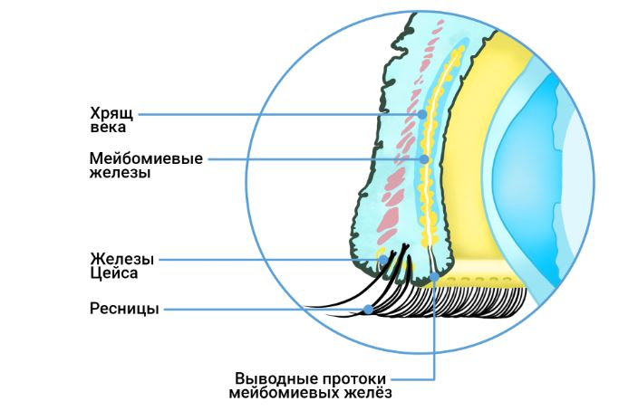 Пока гной находится внутри больной железы, он просвечивает через конъюнктиву вывернутого века желтоватым цветом. Позже он прорывает конъюнктиву или опорожняется через отверстие железы. При поражении мейбомиевой железы гной часто прорывается через кожу, при поражении цейсовской железы подобное происходит очень редко.