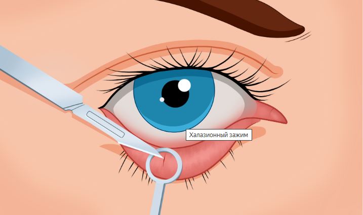 Во время операции веки вывернуты. Чтобы удержать веко на месте по центру ячменя, используется халазионный зажим.